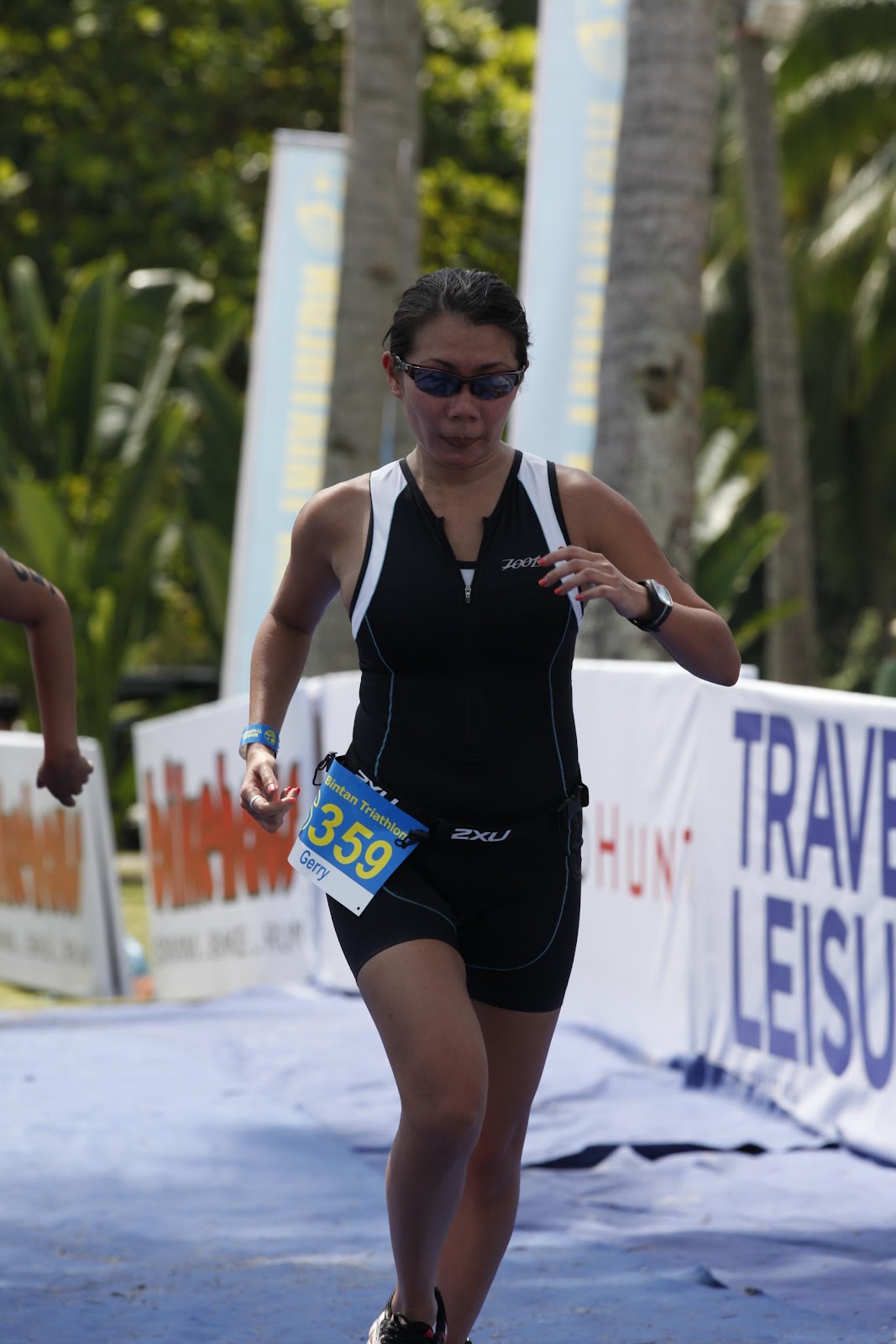 I was so happy when I shoved my sandy, salt-watery timing chip to Mun and could finally grab some water...from the water bottle that Rich passed to me. Mind you there was still no water point in sight. I think they just hate the swimmers. That has to be it.